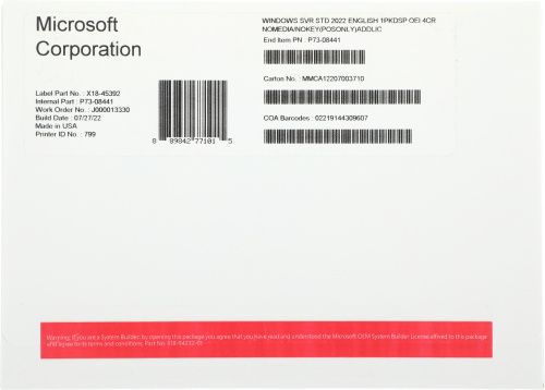 ПО Microsoft Windows Server Std 2022 Eng 1pkDSP OEI 4Cr NoMedia/NoKey(POSOnly)AddLic (P73-08441)